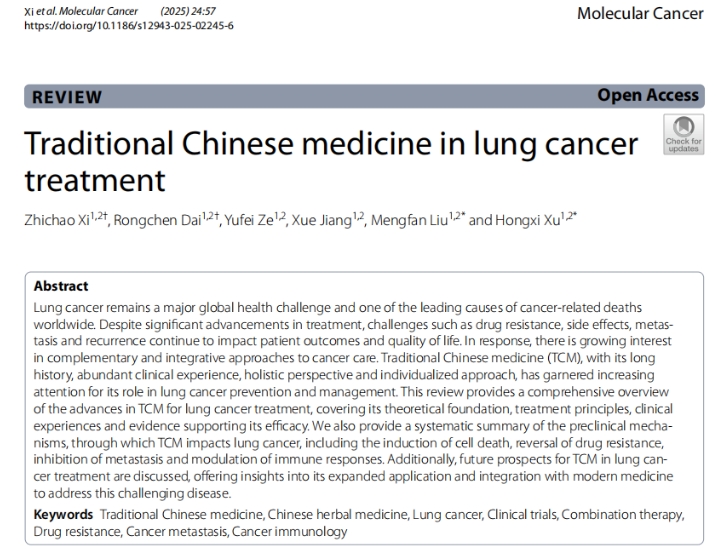 近日,我院首席教授徐宏喜团队在国际知名学术期刊Molecular Cancer上发表题为Traditional Chinese medicine in lung cancer treatment的综述论文。该论文系统回顾了中医药治疗肺癌的历史沿革与理论依据,全面总结了近年来中医药在肺癌治疗中的临床应用成果,并深入剖析了中药抗肺癌的多重作用机制,包括诱导癌细胞凋亡、逆转肿瘤耐药性、抑制肿瘤转移与复发、调节免疫微环境等。