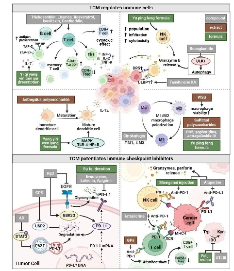 在抗肿瘤转移方面,中药具有多环节的调控作用:一方面可通过抑制血管内皮生长因子(VEGF)信号通路来阻断肿瘤血管生成;另一方面能够调节转移前微环境的形成,抑制上皮-间质转化(EMT)过程,从而降低肺癌细胞的侵袭和转移能力。值得注意的是,中药在免疫调节方面展现出独特优势,其可通过激活自然杀伤细胞(NK细胞)、调节T淋巴细胞亚群平衡、促进树突状细胞成熟等多种途径增强机体抗肿瘤免疫应答。特别是在免疫检查点抑制剂治疗中,中药可协同增强程序性死亡受体-1(PD-1)/程序性死亡配体-1(PD-L1)抑制剂的疗效,为肺癌的免疫治疗提供了新的思路。