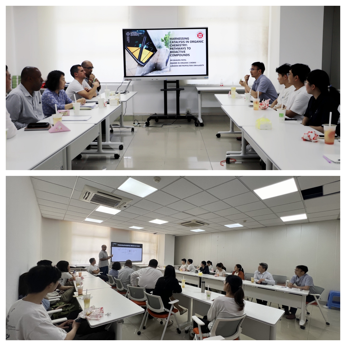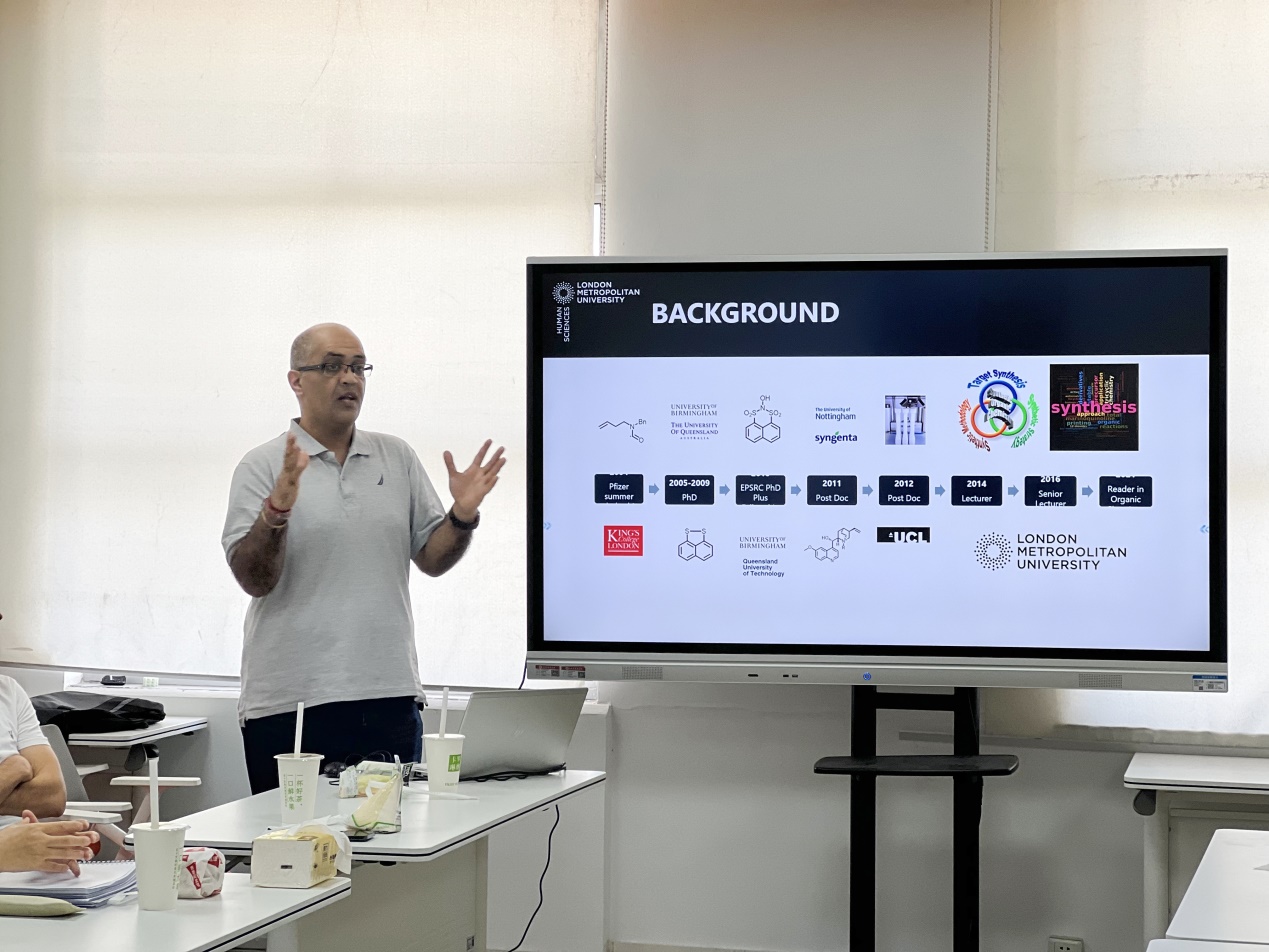 随后,英方教师Dr. Bhaven Patel和Dr. Bruno Sil dos Santos分享了他们的研究经历和成果。Dr. Bhaven Patel介绍了团队在有机化学合成领域取得的研究成果,详细探讨了具有多重生物活性的马里诺喹啉和有机磷类衍生物的合成策略,并指出流动化学技术在提升药物合成效率方面的重要贡献。Dr. Bruno Sil dos Santos分享了自己跨学科研究的经历,重点介绍了3D打印技术在化学领域的创新应用。研究团队从基础模型打印逐步发展到复杂设备研发,如便携式光谱仪和药物载体材料,并探索了环保型材料及药物渗透技术。他鼓励同学们将自身所学的基础知识应用于新的研究领域,创造性地解决实际问题。分享会后,老师和同学们就感兴趣的问题同英方老师进行了热烈的讨论。