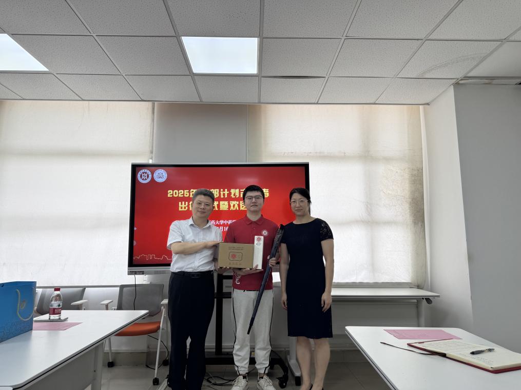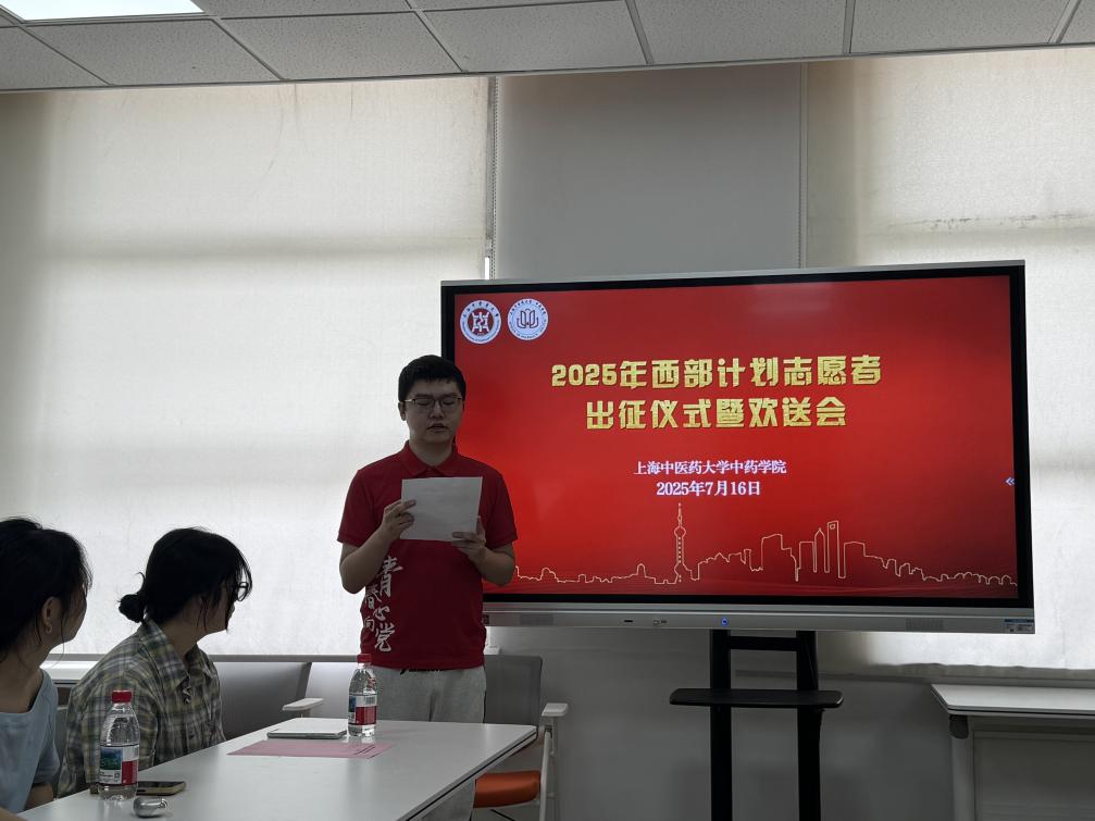 7月16日上午,我院在9403会议室为西部计划志愿者杨境哲同学隆重举行出征仪式暨欢送会。我院党委书记车荣华、院长张彤、党委副书记陆婧,辅导员、学生代表共同出席。仪式上,张彤院长高度赞扬了杨境哲响应国家号召、服务西部的奉献精神,鼓励他在实践中锤炼本领,服务人民健康。我院领导为其赠送了践行礼物,表达关怀与期许。杨境哲满怀激情发言,表达了扎根基层、用中医药知识守护西部群众健康的坚定信念。辅导员与学生代表也表达了敬佩、祝福与支持。