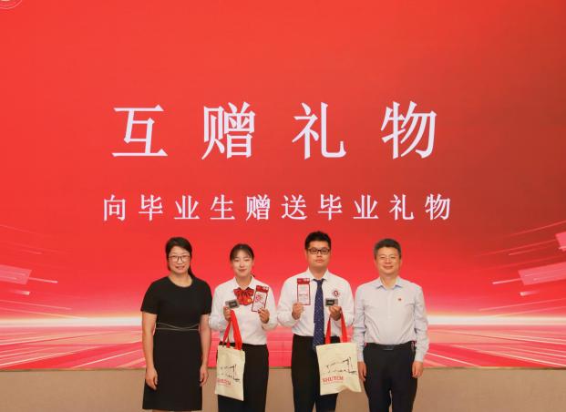 随后,我院党委书记车荣华、院长张彤将象征启航、美好与幸福的礼物赠予毕业生,祝愿每一位毕业生带着学校、学院的印记,自信从容地走向未来。同时,学生代表也向学院献上了承载着感激与祝福的礼物——一幅画有毕业生们以及学院领导老师专属卡通形象的画作。这份礼物传递着情感,温暖着心灵,见证了师生间的深厚情谊与难忘时刻,表达了毕业生们的心永远和学院在一起的美好心愿。