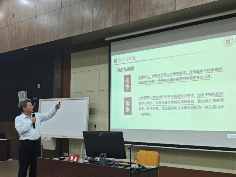 2025年9月24日下午,上海中医药大学中药学院2025级全体新生在6504教室进行新生教育系列活动——“院长第一课”。中药学院院长张彤为新生们做题为“中药人的初心和使命”主题讲座。讲座由中药学院党委副书记陆婧主持,中药学院全体新生辅导员出席。