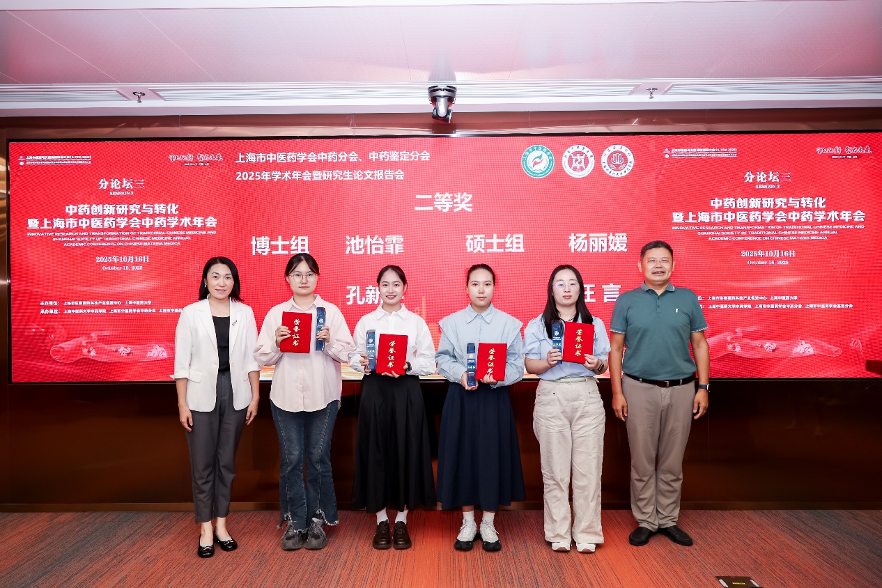 下午场研究生论文报告会由中药学院副院长胡凯莉主持。来自复旦大学、上海交通大学、海军军医大学、上海药物研究所、中国医药工业研究、上海中医药大学及附属医院等单位的12位硕博士研究生分享了中药相关领域的最新研究进展。我校牛宁宁同学获一等奖、池怡霏、杨丽媛同学获二等奖、王楠同学获三等奖。