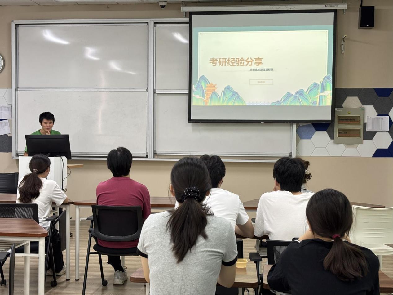 分享伊始,徐志超同学以《基本信息与初试经验》《复试经验与经验教训》为主题,从复习规划、时间安排、复习内容与资料选择等方面出发,系统讲解了考研全过程。他结合自身经历,细致分享了在备考期间如何平衡课程学习与复习进度、如何选择高效资料、以及在紧张阶段如何保持稳定心态。他鼓励同学们:“考研是场耐力赛,更是自我成长的过程,稳扎稳打比盲目努力更重要。”