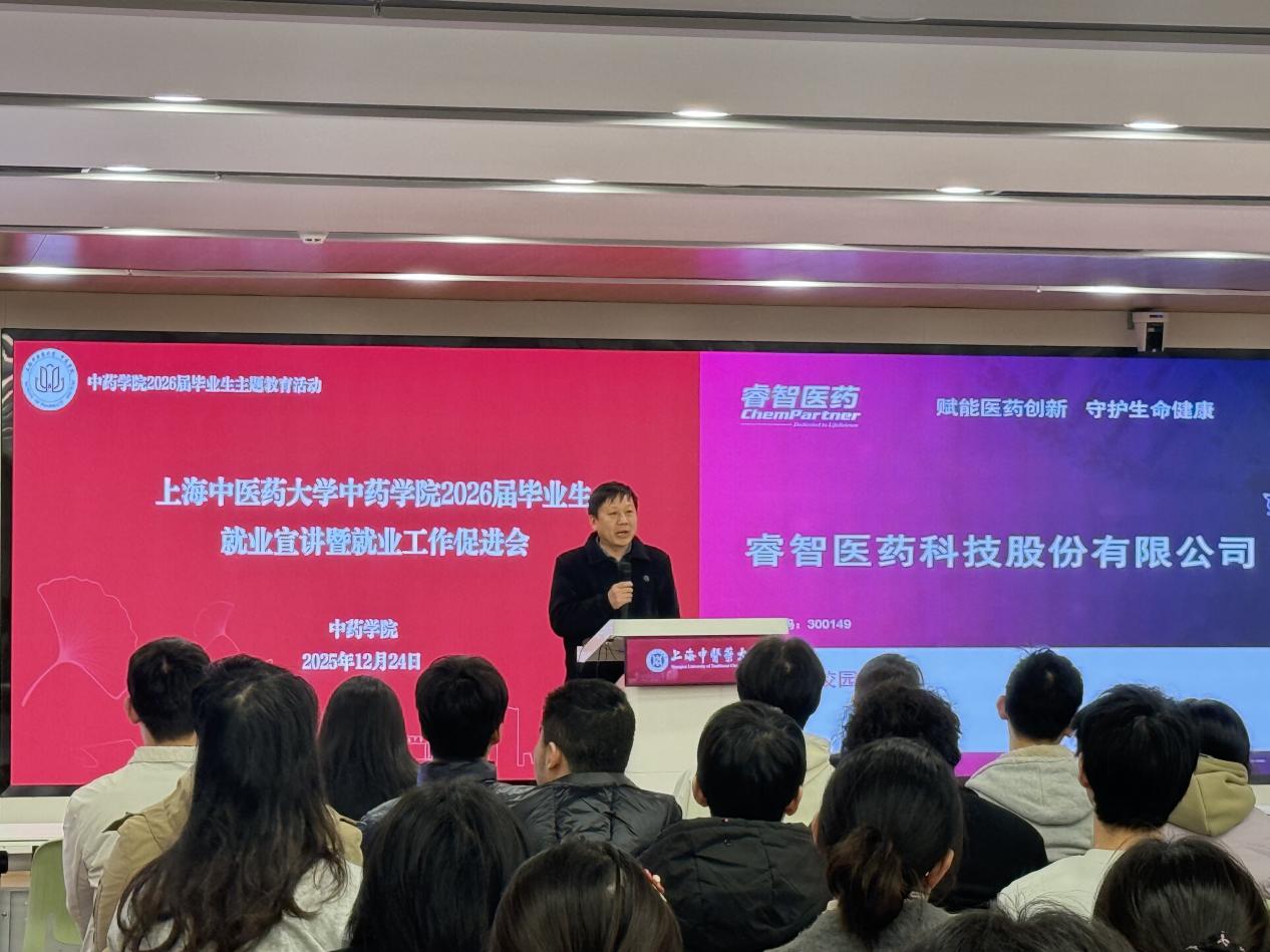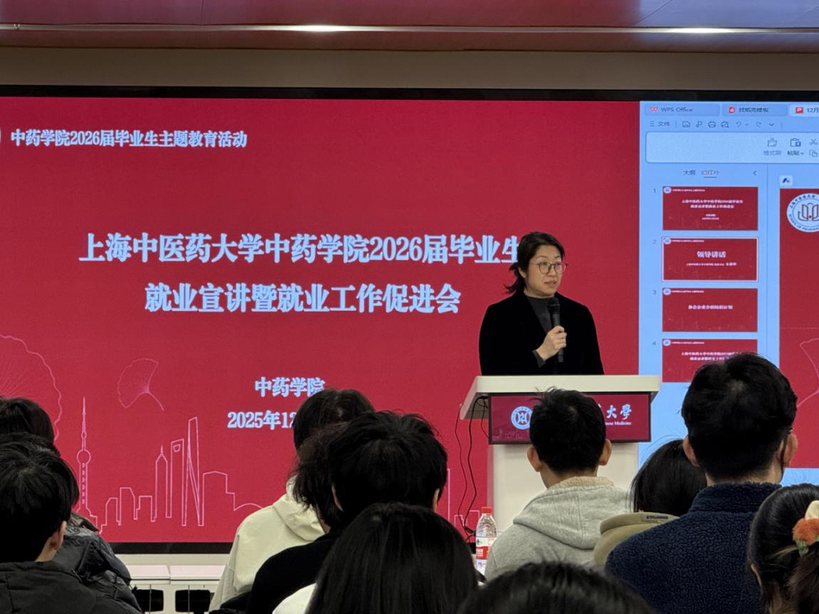 为深入学习贯彻习近平新时代中国特色社会主义思想,全面贯彻党的教育方针,扎实落实立德树人根本任务,切实推进2026届毕业生就业工作,搭建校企精准对接桥梁,助力中药学子实现高质量充分就业, 2025年12月24日下午,我院在标准化大楼辅楼301会议室成功举办2026届毕业生就业宣讲会。我院党委书记车荣华、党委副书记陆婧出席本次活动,活动由辅导员王盼主持。