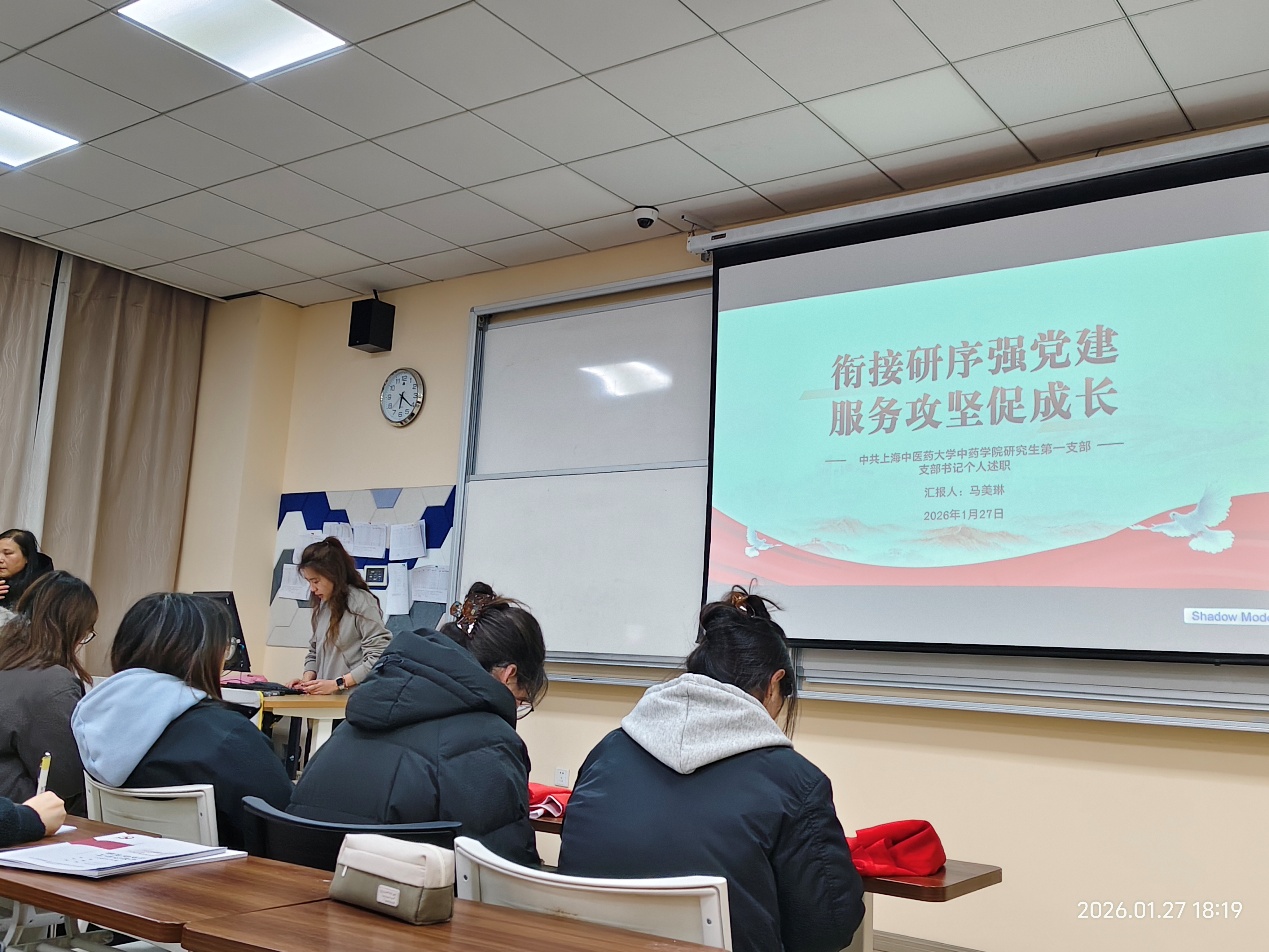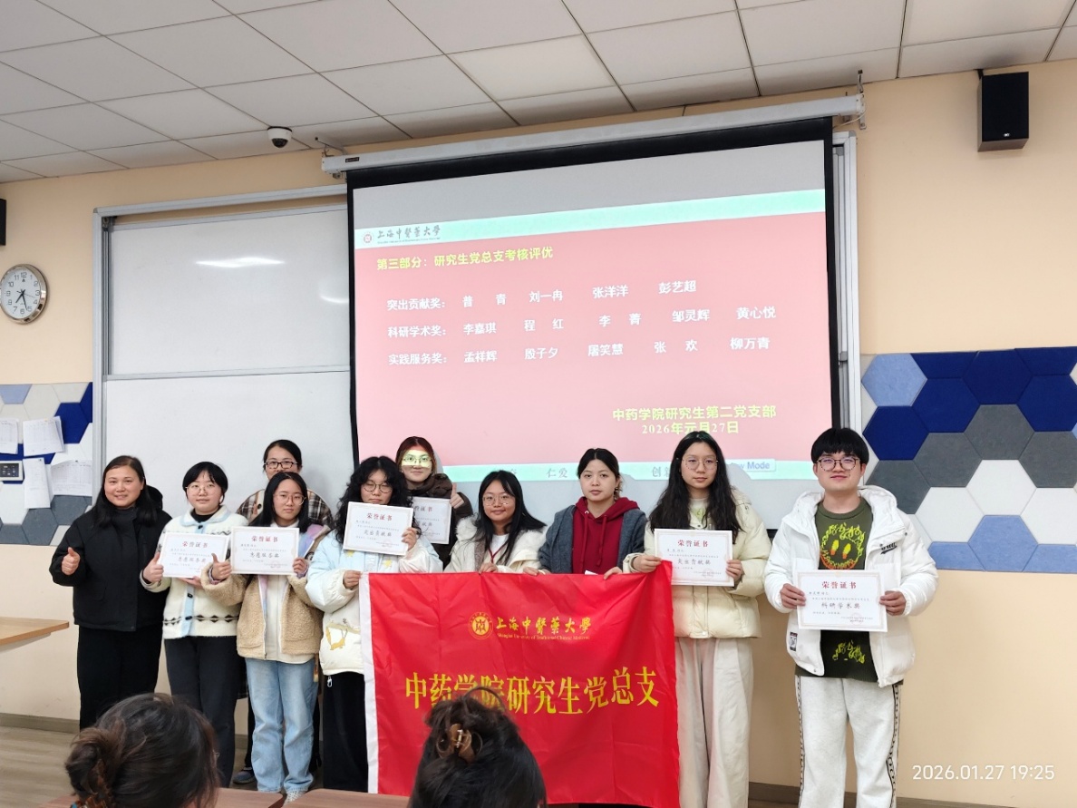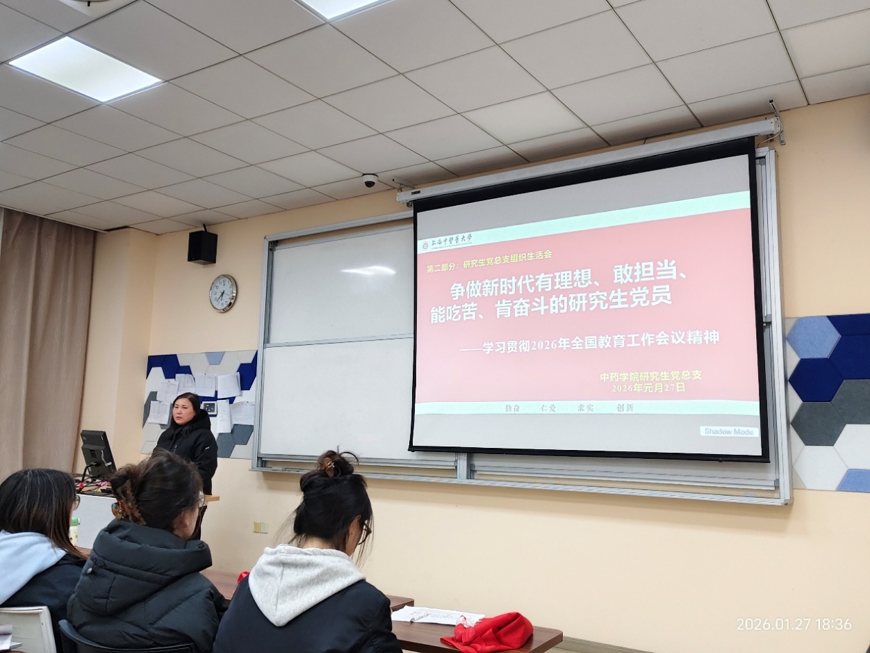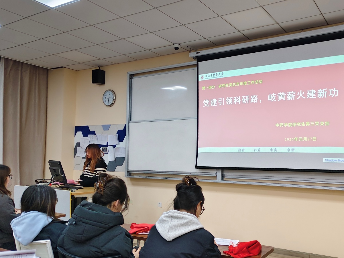 2026年1月27日晚18点,上海中医药大学中药学院研究生党总支在7304教室召开以“争做新时代有理想、敢担当、能吃苦、肯奋斗的研究生党员”为主题的2025年度党员总结会。本次会议由中药学院研究生党总支书记陈秀兰同志主持,党总支全体党员参会。