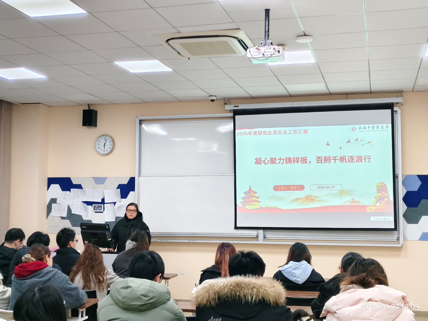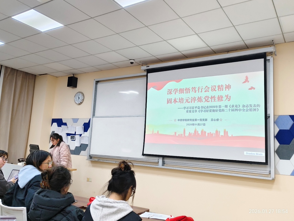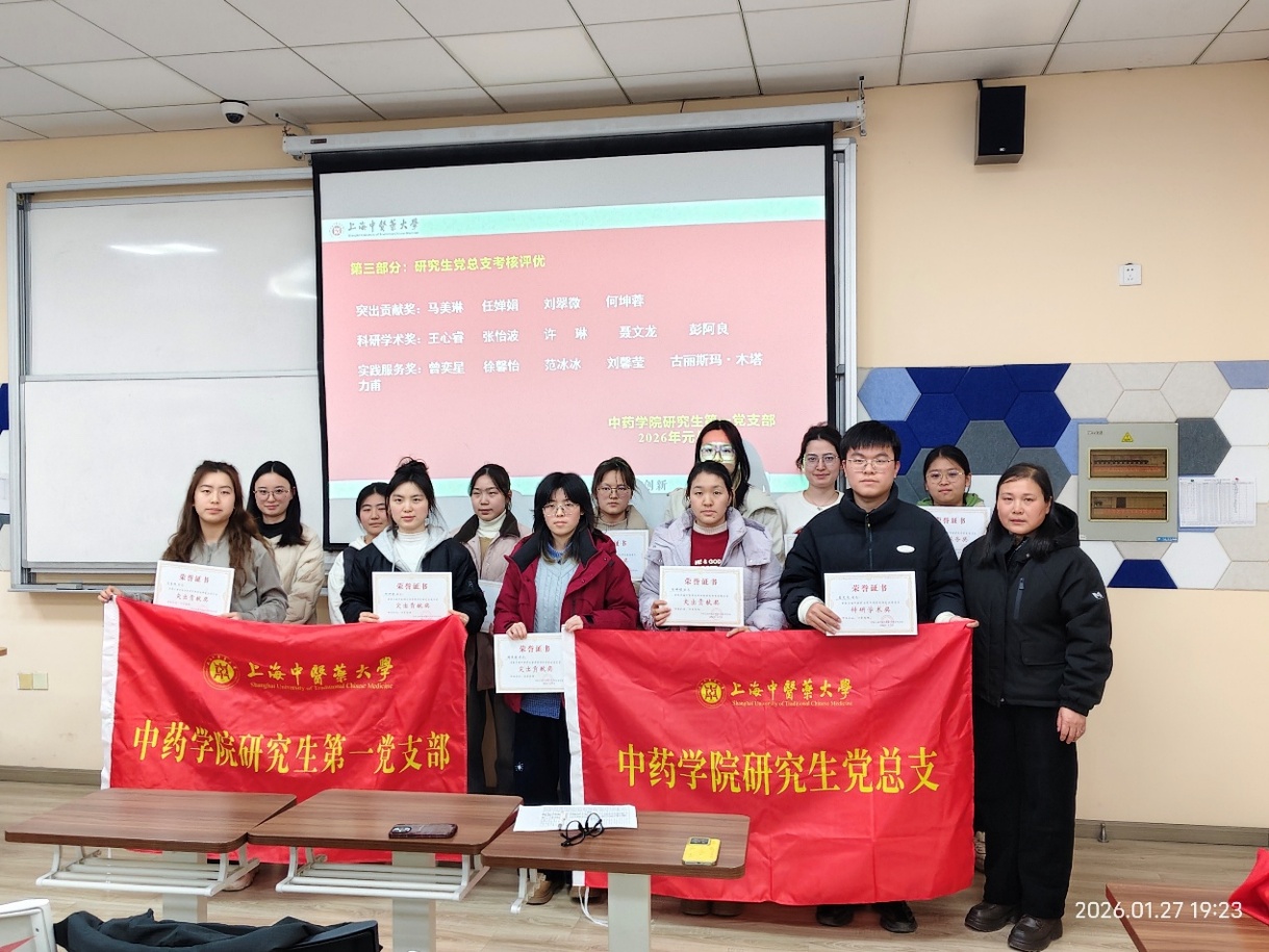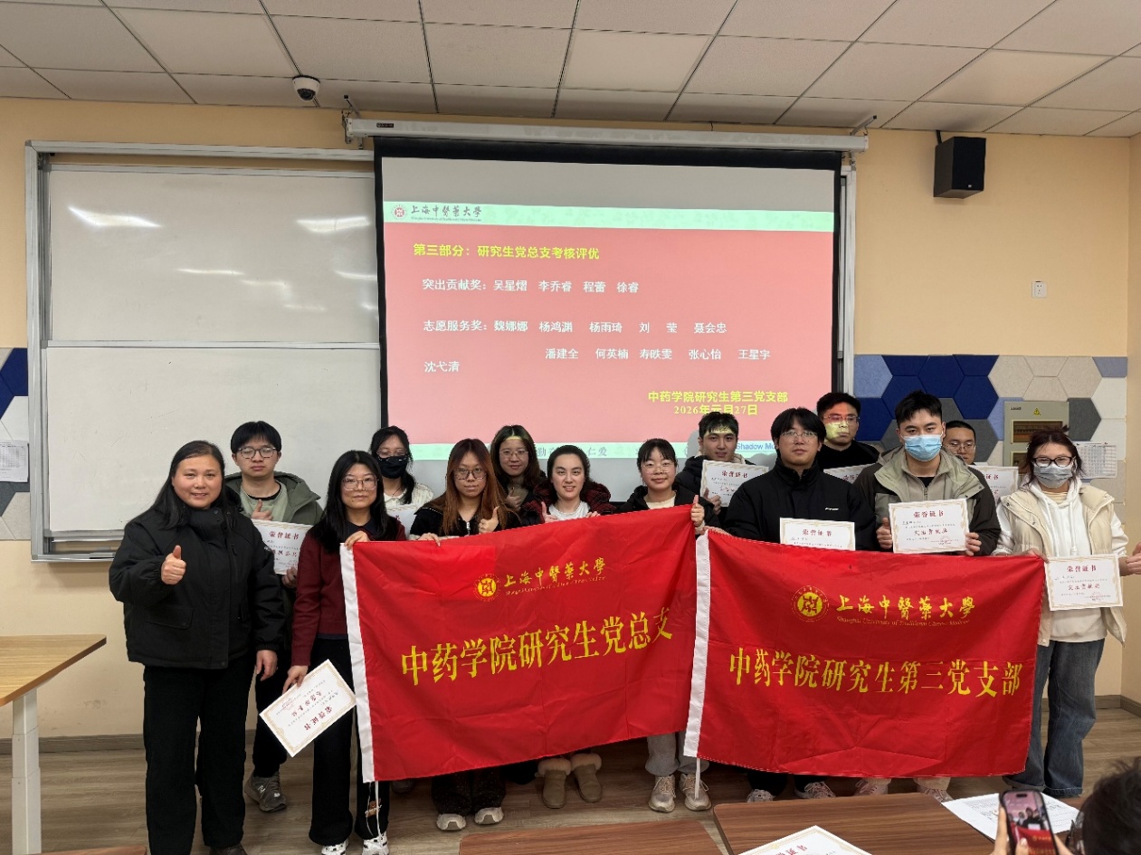 2026年1月27日晚18点,上海中医药大学中药学院研究生党总支在7304教室召开以“争做新时代有理想、敢担当、能吃苦、肯奋斗的研究生党员”为主题的2025年度党员总结会。本次会议由中药学院研究生党总支书记陈秀兰同志主持,党总支全体党员参会。