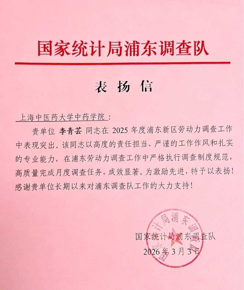 近日,国家统计局浦东调查队向上海中医药大学中药学院发来表扬信,对我院李青芸同学在2025年度浦东新区劳动力调查工作中的突出表现予以表扬,充分肯定其责任担当、工作作风与专业能力。