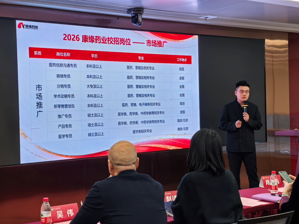 中药学院院长张彤致欢迎辞,他代表学院全体师生对长期以来康缘药业给予学院人才培养和实习就业工作的大力支持致以衷心感谢。张院长还着重指出,当前中医药事业与产业发展已上升为国家战略,迎来前所未有的黄金机遇期。他勉励在场毕业生,作为新时代的中医药人,要深刻把握时代机遇,坚定专业自信,积极投身于中药传承创新的伟大实践,在广阔天地中施展才华、大有作为。希望以本次校招为契机,进一步深化合作,为毕业生提供更多优质就业机会,为中医药行业输送更多专业人才。