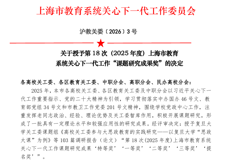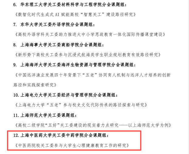 2026年3月10日,上海市教育系统关心下一代工作委员会公布第18次(2025年度)关心下一代工作课题研究成果表彰名单,上海中医药大学关工委中药学院分会申报的《中医药院校关工委参与大学生心理健康教育工作的研究》课题荣获一等奖。